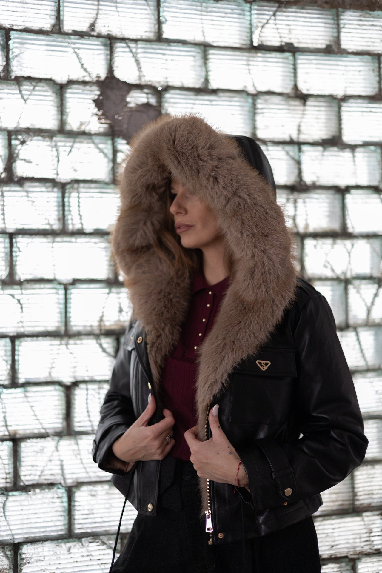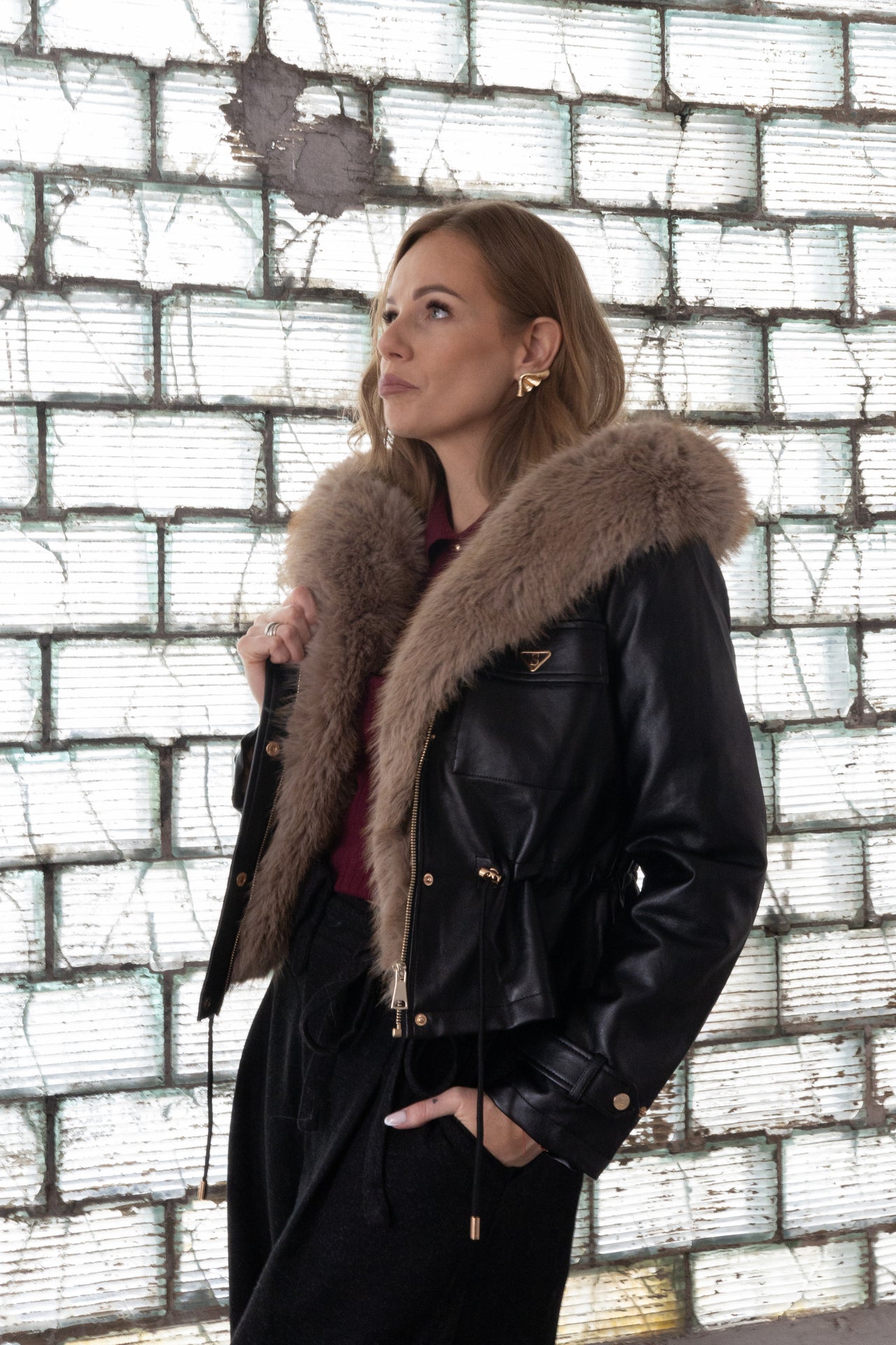 Talia została podkreślona regulowanym troczkiem, co pozwala dopasować krój do sylwetki. Złote detale i ozdobne guziki nadają kurtce charakteru. Praktyczne kieszenie z patkami i ozdobnym emblematem dodają jej funkcjonalności. Futro jest w całości odpinane.