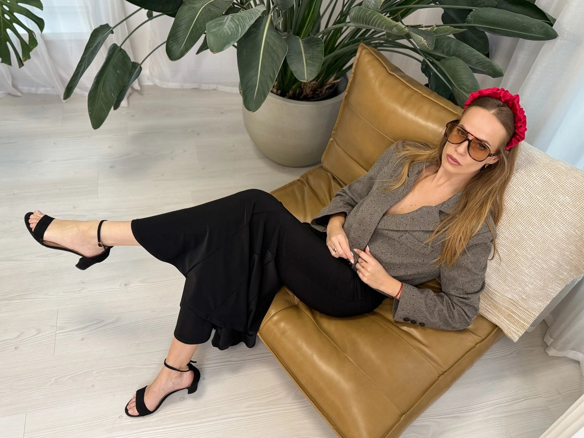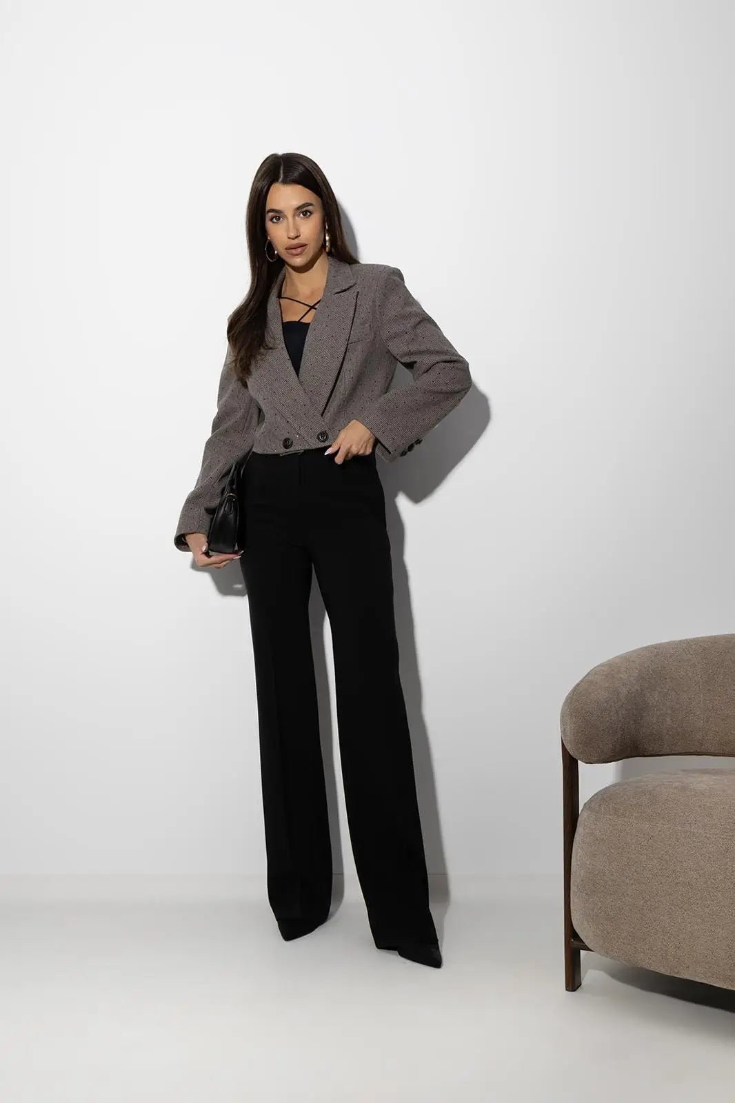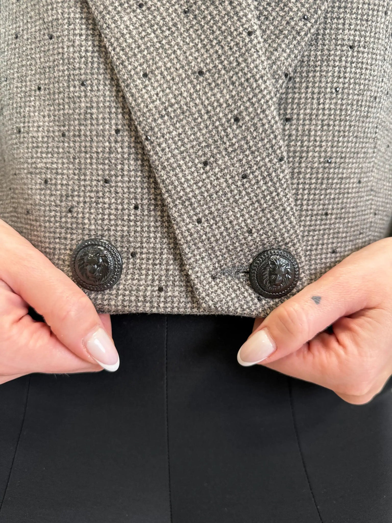 Elegancka marynarka w drobną pepitkę to idealne połączenie ponadczasowego stylu i nowoczesnej formy. Wykonana z wysokiej jakości tkaniny o wyraźnej strukturze, doskonale układa się na sylwetce i nadaje stylizacji wyrafinowanego charakteru. Została ozdobiona drobnymi czarnymi koralikami, które subtelnie połyskują przy ruchu, nadając całości niepowtarzalnego stylu. Model Diva posiada klasyczny kołnierz i ozdobne guziki z tłoczonym wzorem, które dodają całości elegancji. Neutralna kolorystyka sprawia, że marynarka jest niezwykle uniwersalna. Świetnie komponuje się zarówno ze spodniami, jak i spódnicą.