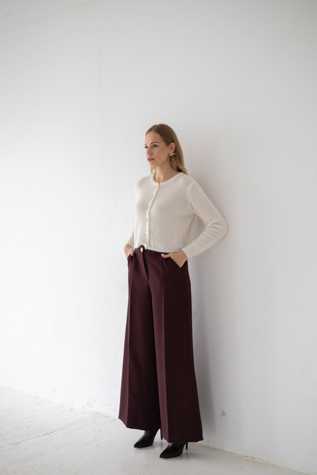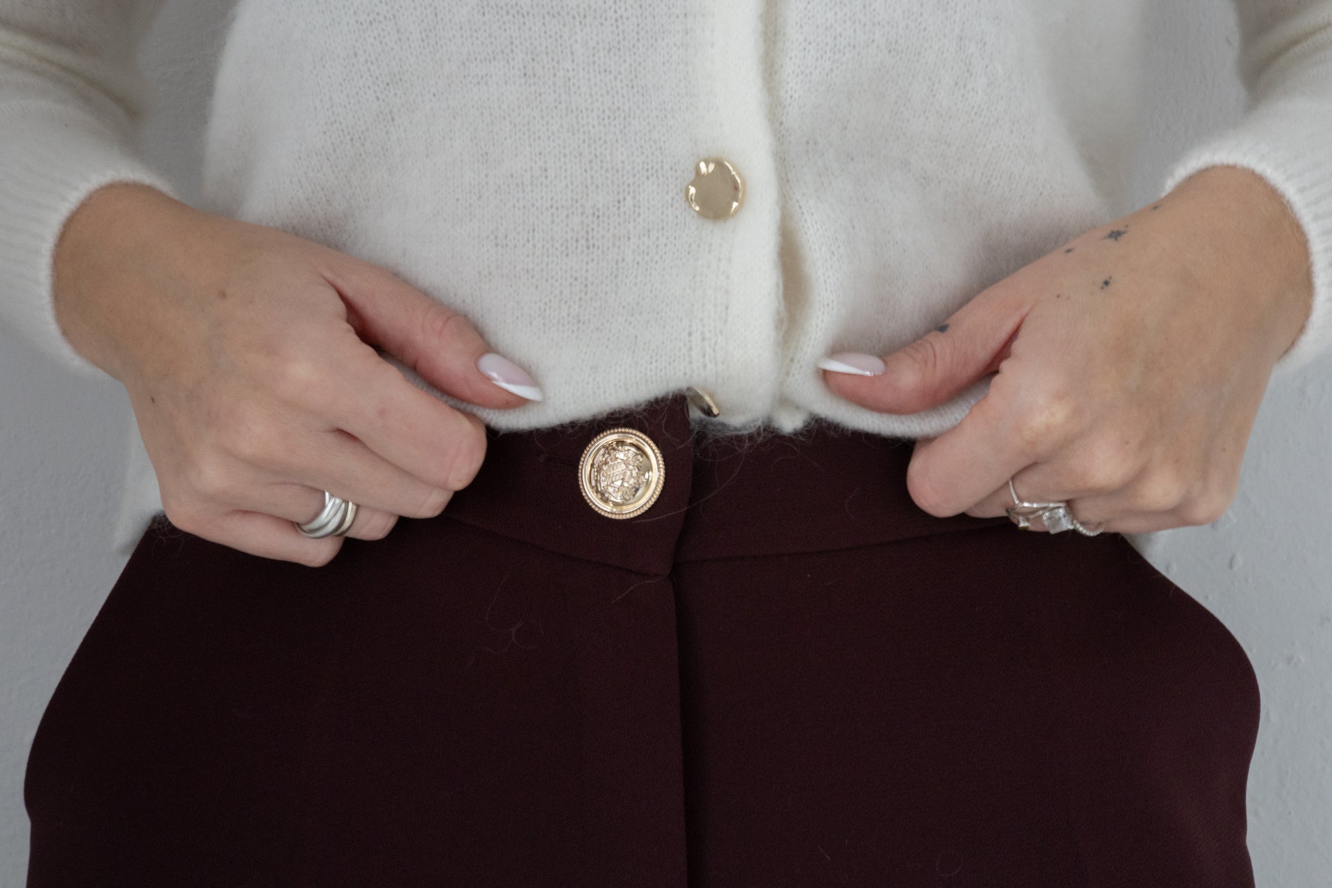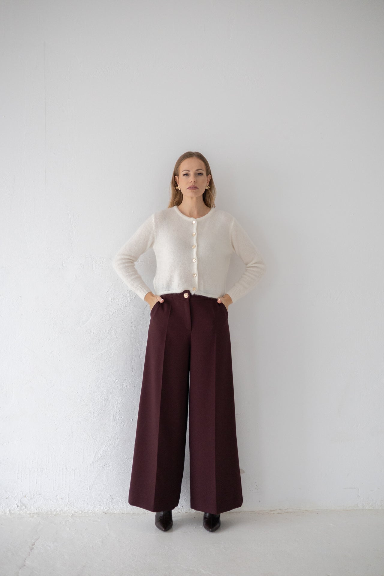Stylowe, długie spodnie Bridget o szerokim kroju to idealne połączenie elegancji i wygody. Wykonane z gładkiego materiału, pięknie układają się na sylwetce, a wysoki stan podkreśla talię i optycznie wydłuża nogi. Złoty, ozdobny guzik dodaje im klasycznego, kobiecego charakteru. Model Bridget sprawdzi się zarówno w stylizacjach do pracy, jak i na wieczorne wyjście. Wystarczy połączyć je z koszulą, swetrem lub dopasowanym topem, aby stworzyć elegancki i nowoczesny look.