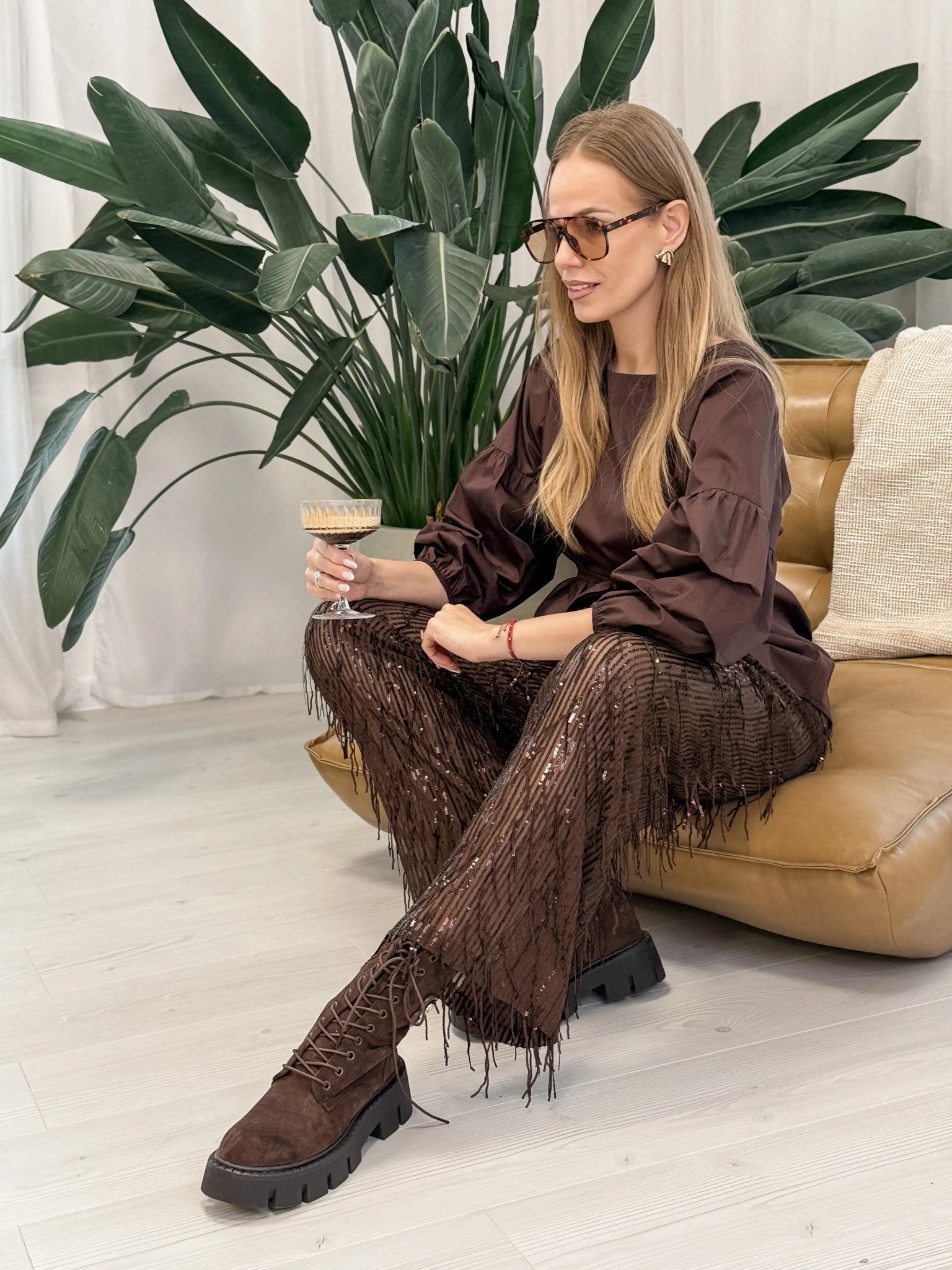 Wyróżnij się blaskiem! Te eleganckie spodnie w odcieniu czekolady to idealne połączenie klasy i odrobiny ekstrawagancji. Wykonane z miękkiego, przyjemnego w dotyku materiału, doskonale dopasowują się do sylwetki, podkreślając jej kształty.